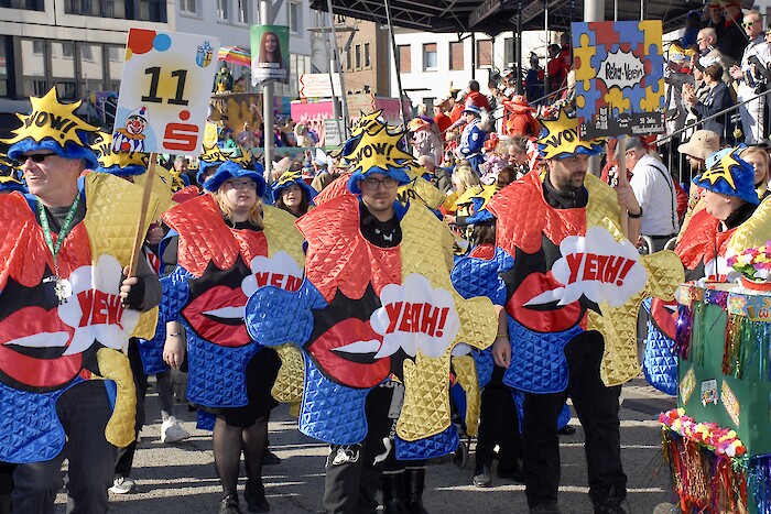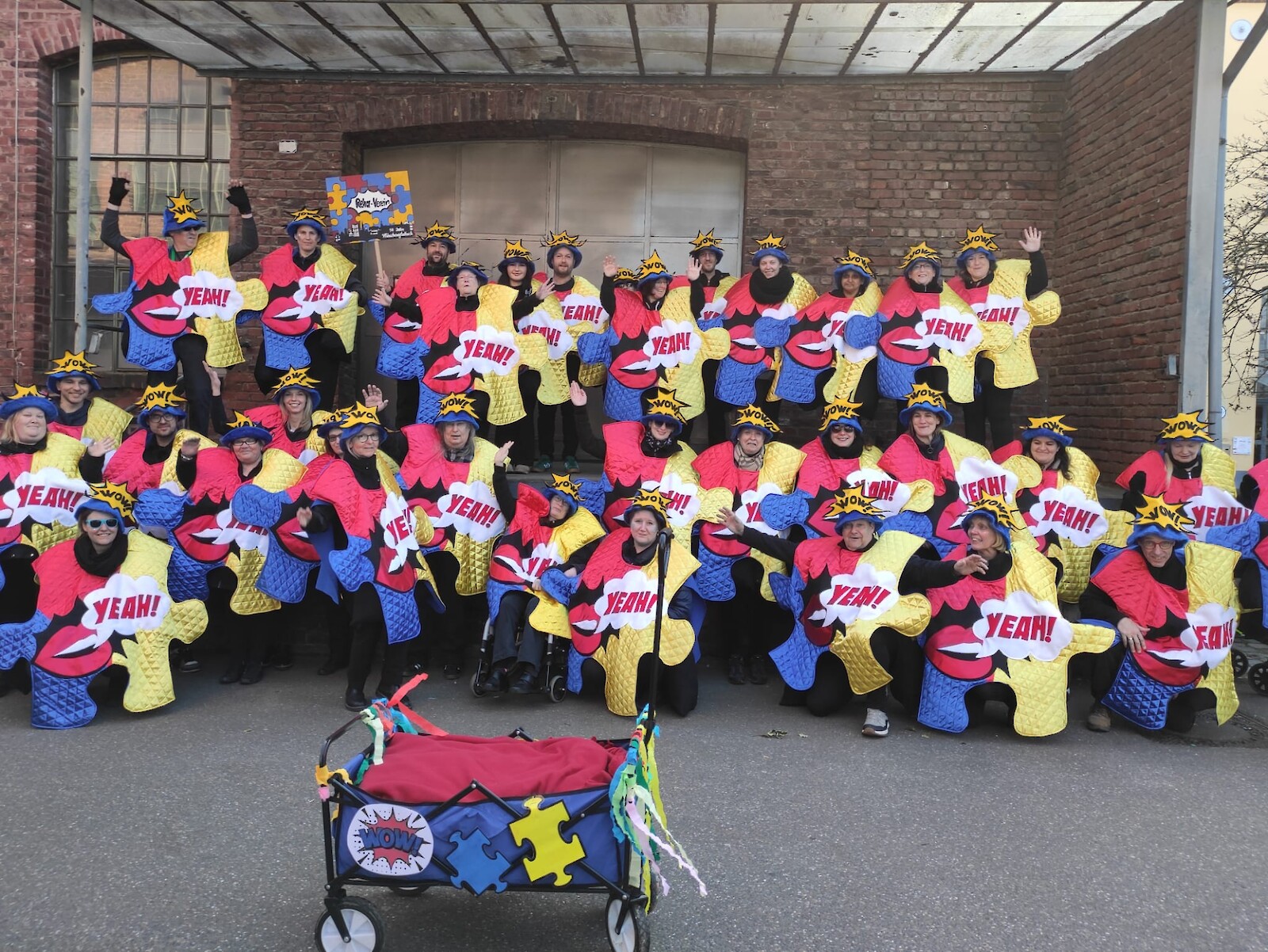 2025 lief der Mönchengladbacher Veilchendienstagszug unter dem Motto „Jubel, Trubel, Heiterkeit – 50 Jahre jecke Zeit“ und 60 Karnevalsbegeisterte aus dem Umfeld des Reha-Vereins liefen mit. Die Fußgruppe setzte sich zusammen aus Menschen mit psychischer Erkrankung. Mitarbeiter*innen des Reha-Vereins, Patient*innen und Mitarbeiter*innen der LVR-Klinik Mönchengladbach, weiteren Bürger*innen der Stadt (Angehörige, Nachbar*innen, Freundeskreise). Die phantasievollen Verkleidungen waren vorab gemeinsam entworfen und in der Textilwerkstatt des Vereins geschneidert worden.