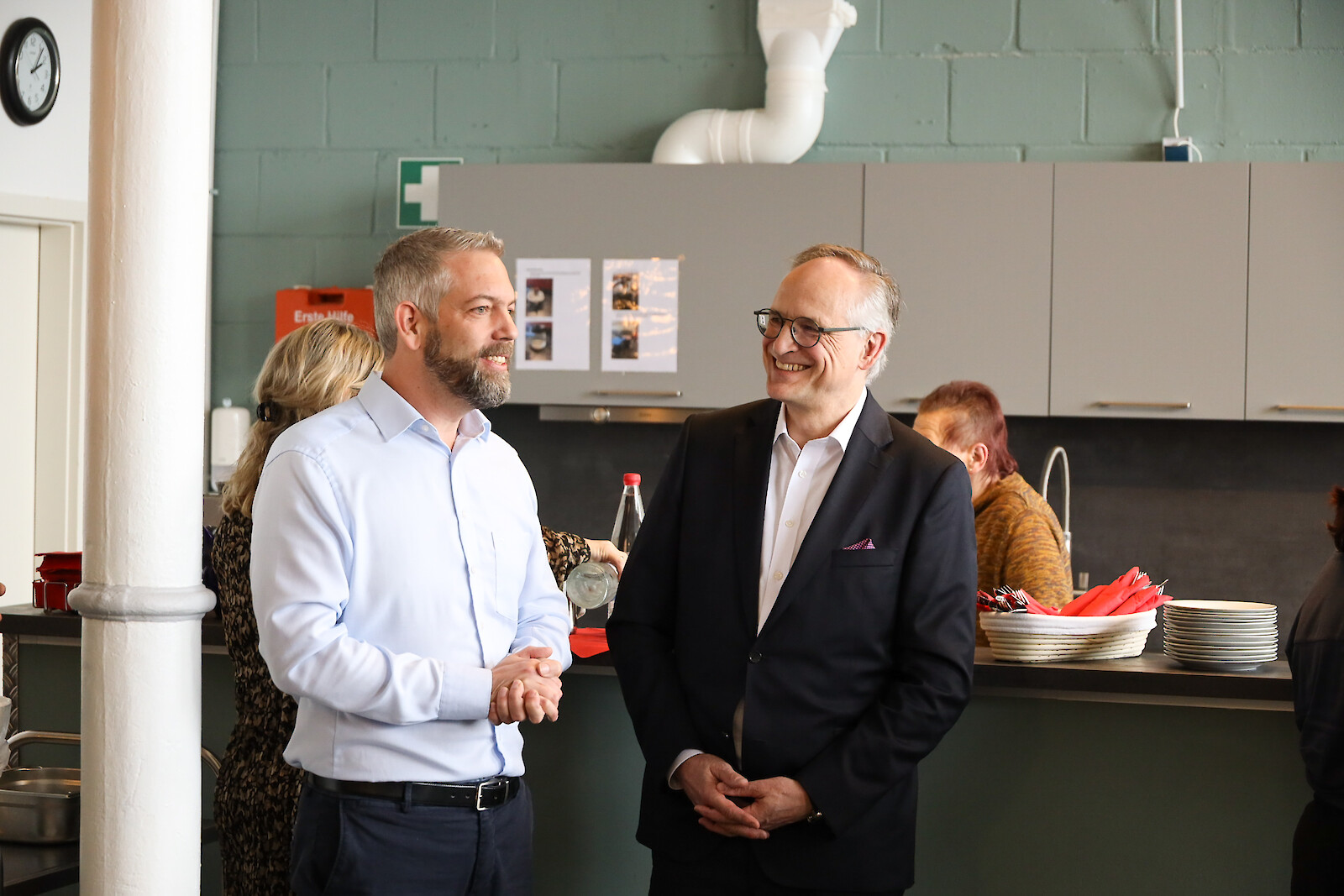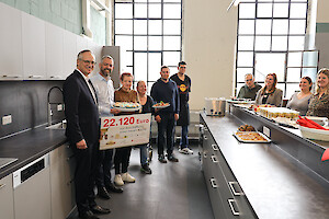 Zur offiziellen Einweihung kam der Vorstandsvorsitzende der Sparkassenstiftung, Antonius Bergmann mit mehreren Mitarbeitenden, einem großen Korb voller Schokoladen-Osterhasen und natürlich mit dem symbolischen Scheck, der als Bild sicher einen Platz in der Küche finden wird. Alle bewunderten das neue Küchendesign (in dezentem Agaven-Grün) und die ansprechende Caféhaus-Atmosphäre. Die Mitarbeitenden der Hauswirtschaftsgruppe hatten zur Feier des Tages ein leckeres Fingerfood-Buffet zubereitet, bei dem kräftig zugegriffen wurde. "Das ist der Ort, an dem die Menschen zusammenkommen und gemeinsam ein gesundes Essen genießen können," beschreibt die zuständige Teamleiterin Mara Wolk das Angebot.